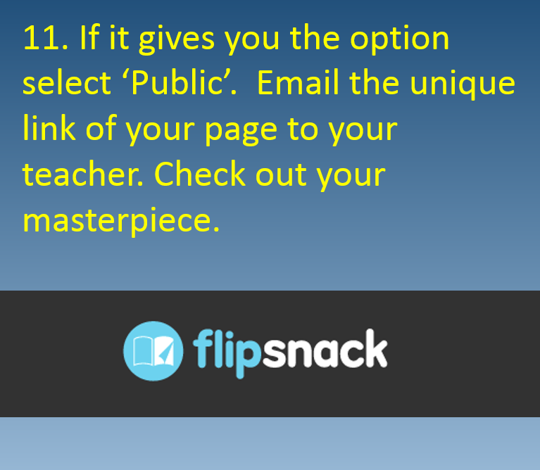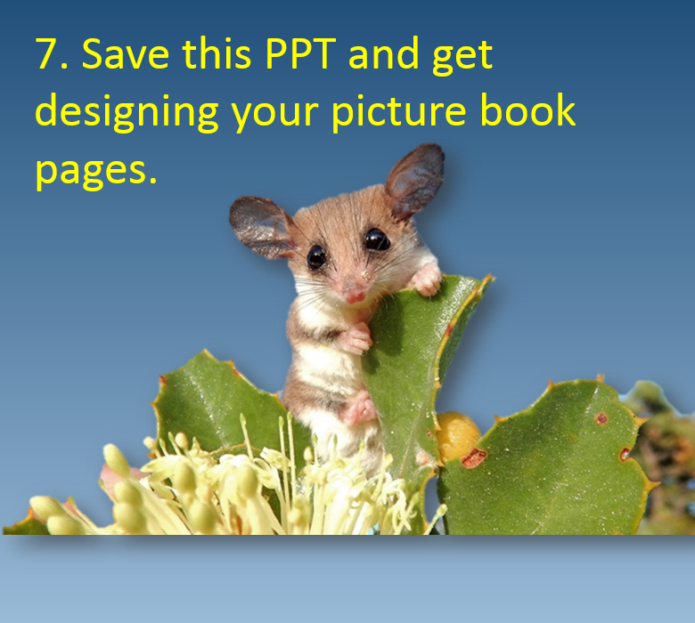 Some teachers may be requiring a digital picture book hosted on a site such as FlipSnack. You must be at least 13 years old to use FlipSnack. Click here to see an example created by Mrs Roberts entitled "Leave Nothing Behind". You may follow the same steps (using PPT formatted to A4 pages: portrait or landscape) but you must save your final PPT as a pdf then upload to FlipSnack. FlipSnack has a limit of 15 pages in pdf format. Make sure you send the public link to your teacher so they can view your flipping picture book.
